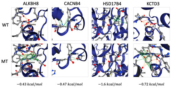 Examples of predicted destabilizing effects of variants on protein structure. Wild type (WT) and mutated (MT) protein structures predicted by AlphaFold and DynaMut2 for ALKBH8, CACNB4, HSD17B4, and KCTD3 genes. Numerous changes in intermolecular hydrophobic (green) and polar (red) bonds are shown, with the destabilizing effects quantified by the ΔΔGStability value displayed at the bottom.