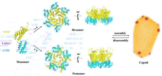 Structures of the HIV-1 CA monomer (PDB: 4XFX), hexamer (PDB: 4U0D), pentamer (PDB: 5MCY), and capsid (PDB ID: 3J3Q). The N-terminal domain (NTD) shown in yellow; flexible linker shown in magenta; C-terminal domain (CTD) shown in cyan. Pentamers are shown in red in the complete capsid lattice (brightorange).
