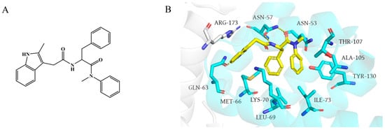 First, it is worth noting the small-molecule inhibitors represented by PF74, lenacapavir, and their derivatives. Currently, the most extensively studied HIV-1 capsid inhibitor is PF-3450074 (abbreviated as PF74), which was developed by Pfizer through structural optimization based on the high-throughput screening hit PF-1385801. PF74 exhibits broad inhibitory activity against HIV isolates and functions at both the early and late stages of viral replication and infection. It is a phenylalanine-derived peptidomimetic compound that consists of a phenylalanine core, an aniline moiety, and a methylindole ring (Figure 2A). It exerts its antiviral effects by binding to the interface between the NTD and CTD of HIV-1 CA. As illustrated in Figure 2B, the phenylalanine backbone primarily interacts with residues such as Asn-57, Lys-70, Met-66, and Leu-69, while the aniline group engages Asn-53, Thr-107, Ala-105, and Tyr-130. The methylindole ring stacks with Arg-173 in the adjacent CTD via cation–π interactions and forms a hydrogen bond with Gln-63 in the NTD [,]. Intriguingly, PF74 exhibits a concentration-dependent bimodal mechanism [,]. At low concentrations (below 2 nM), it competes with host factors CPSF6 and NUP153 for CA binding, thereby impairing nuclear entry. At higher concentrations, PF74 disrupts inter-hexameric CA interactions, inducing premature capsid uncoating and blocking reverse transcription during the early stages of the viral life cycle. Additionally, in the late stage of HIV-1 replication, PF74 accelerates capsid protein assembly, interfering with the formation of morphologically normal viral particles and inhibiting viral maturation. Despite its potent antiviral phenotype, PF74 suffers from suboptimal metabolic stability and limited antiviral potency [], driving extensive efforts to optimize its structure through derivative design to enhance its pharmacological properties [,,,,,].