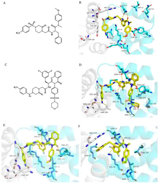 Later on, the same team identified a potent HIV-1 CA modulator, IC-1k (EC50 = 2.69 nM), which demonstrates markedly enhanced metabolic stability in HLM, with a half-life (T1/2 = 91.3 min) that is 130-fold longer than that of the PF74 []. IC-1k preferentially binds to CA hexamers, adopting a structural orientation similar to compounds 12a2 and 21a2. Its 3,5-difluorinated phenyl ring embeds within a hydrophobic pocket formed by Leu56, Met66, Leu69, Lys70, and Ile73, while forming extensive hydrogen-bond interactions with residues Asn57, Gln63, Lys70, and Asn74. The benzothiazole moiety occupies a pocket defined by Thr107 and Lys70, acting as a rigid scaffold that restricts capsid conformational flexibility (Figure 3F). This forced loss of CA plasticity underpins the high antiviral efficacy of IC-1k.