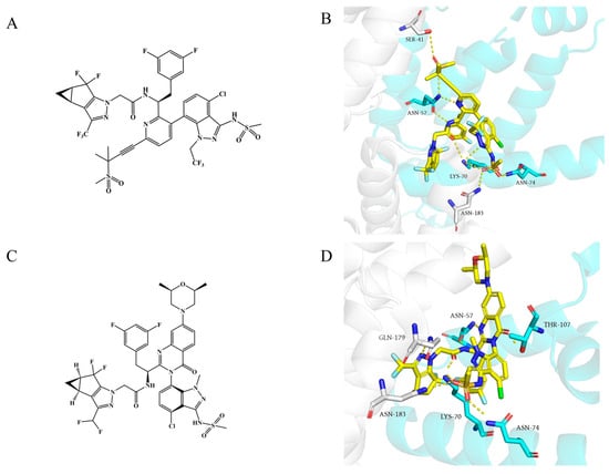 Gilead Sciences modified the PF74 scaffold by incorporating multiple hydrogen bond donors and acceptors to enhance its affinity for the HIV-1 CA, resulting in the development of the famous lenacapavir, also known as GS-6207, with the trade name of Sunlenca (Figure 4A). As the first-in-class, long-acting, ultra-potent HIV-1 CA inhibitor, lenacapavir demonstrated remarkable potency, with an EC50 of 105 pM in the HIV-1-infected MT-4 cells, and EC50 values of 32 pM and 56 pM against HIV-1 in primary human CD4 T cells and macrophages, respectively []. It exhibits high metabolic stability and exceptional antiviral efficacy. Lenacapavir received approval from the U. S. Food and Drug Administration (FDA) on 22 December 2022, for the treatment of multidrug-resistant HIV-1 infection [].