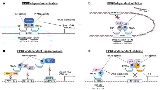 Various mechanisms of transcriptional regulation by PPARα. (a) PPRE-dependent activation. In the presence of specific agonist ligands, the PPARα-RXR heterodimer complex binds to PPREs in the regulatory regions (e.g., promoters or enhancers) of target genes and recruits coactivator complexes, leading to the expression of genes involved in lipid and glucose metabolism. (b) PPRE-dependent inhibition. Upon binding to agonist ligands, agonist-bound PPARα-RXR on the PPRE physically interacts with p65 and interferes with its activity, antagonizing its binding to an NF-kB response element (RE) in the complement C3 promoter. (c) PPRE-independent transrepression. PPARα directly interacts with several transcription factors and coregulators such as AP-1 (c-Fos-C-Jun), NF-kB (p65-p50), and GRIP-1/TIF-2, preventing their binding to cognate response elements and suppressing target gene expression. (d) PPRE-independent inhibition. PPARα binds to ERR RE and recruits to SIRT1, thereby inhibiting ERRα target genes. The ligand-activated PPARα-GR heterodimer complex inhibits TNF-induced IL-6 expression via a mechanism involving a physical interaction with NF-kB. RE, response element; N, any nucleotide.