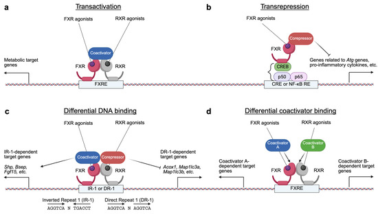 FXR regulates gene expression through several transcriptional mechanisms (Figure 2). Upon activation by specific agonist ligands, the FXR-RXR heterodimer binds to FXREs in the promoters or enhancers of target genes, dissociating corepressor complexes but recruiting coactivator complexes to induce the expression of genes involved in BA and metabolic pathways. FXR can also mediate transrepression independently of FXREs by physical interactions with other transcription factors such as CREB or NF-kB, thereby inhibiting their activities and suppressing genes related to autophagy and inflammation. Additionally, the FXR-RXR complex can recognize different DNA motifs, including IR-1 and DR-1, resulting in opposite transcriptional outputs. The recruitment of various coactivator complexes further contributes to the specificity of FXR target gene regulation. Through these mechanisms, FXR plays a crucial role in maintaining metabolic homeostasis [152].
