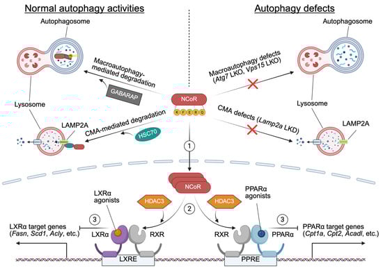Nevertheless, subsequent studies have reaffirmed the importance of NCoR-mediated nuclear receptor repression in autophagy-deficient conditions. Alb-Cre; Atg7F/F or Alb-Cre; Vps15F/F mice show increased accumulation of transcriptional repressors HDAC3, NCoR, or both, which suppress the activity of PPARα and LXRα. These nuclear receptors are critical for FAO, ketogenesis, and de novo lipogenesis. Fasting-induced autophagy is necessary for NCoR degradation via the interaction of GABARAP family proteins, resulting in PPARα activation and induction of its target genes. These findings highlight the critical role of hepatic autophagy in maintaining metabolic homeostasis during fasting by fine-tuning the levels of transcriptional repressors such as NCoR [7,8,12] (Figure 5).