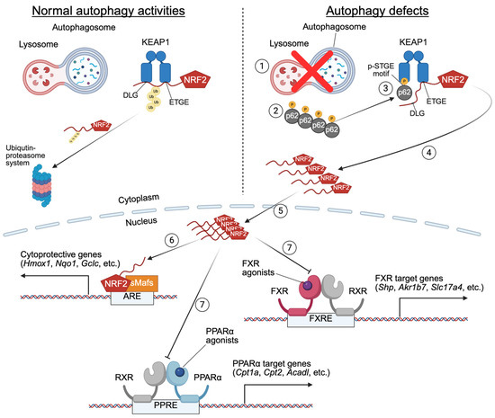 Consistent with these opposing but complementary roles, these nuclear receptors have been found to govern autophagy, another adaptive response in the liver with significant metabolic implications [6]. Conversely, accumulating studies suggest that hepatic autophagy activity markedly affects PPARα or FXR-dependent metabolic pathways such as FAO, ketogenesis, and BA homeostasis [7,8,9,10,11]. Ablation of core autophagy genes in a hepatocyte-specific manner remarkably blunts the expression of target genes of PPARα, FXR, or liver X receptor α (LXRα, also known as NR1H3), which are involved in FAO, ketogenesis, BA biosynthesis, and de novo lipogenesis, leading to the development of intrahepatic cholestatic injury. Earlier studies have also supported this by showing that nuclear accumulations of nuclear receptor corepressor 1 (NCoR), one of the well-defined corepressors, inhibit the transactivation of PPARα, FXR, or LXRα in these mutant animals [7,8,12]. Recent findings, including our studies, suggest another potential mechanism by which the activities of nuclear receptors are compromised in autophagy-deficient hepatocytes. Enhanced cytoplasmic interactions between p62 (also known as sequestosome 1) and kelch-like ECH-associated protein 1 (KEAP1) in the liver of autophagy-defective mutant mice promote the translocation of nuclear factor erythroid 2-related factor 2 (NRF2), a key transcription factor for antioxidant defense, from the cytoplasm to the nucleus. This process appears to hinder the transactivation of PPARα and FXR, although the underlying mechanisms remain unclear [9,10,11].