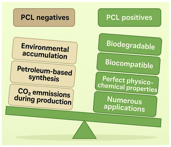 One of PCL’s most critical environmental attributes is its biodegradability. However, PHA, PCL, and their blends are not always biodegradable or may need conditions only available in industrial-scale composting facilities [9,10]. Efficient polycaprolactone (PCL) breakdown in natural environments relies on specific external factors, including temperature, salinity, microbial activity, and other ecological conditions. When these factors are suboptimal, the polymer’s persistent nature can lead to limited biodegradability and microplastic accumulation, posing long-term environmental risks [11,12].