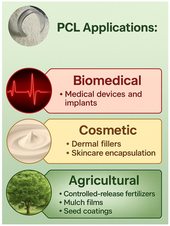 Polycaprolactone (PCL) is widely valued across various industries for its distinctive thermoplastic behavior, biocompatibility, and hydrophobic nature. Its applications extend to the biomedical field, cosmetics, and agriculture (Figure 3), where it enhances product functionality, improves delivery mechanisms, and supports sustainable practices.