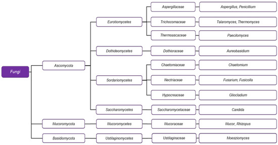 PCL-degrading fungi show less taxonomic diversity in representative phyla than bacteria (Figure 5). Except for the basidiomycete Moesziomyces antarcticus and two members of Mucoromycota, Mucor and Rhizopus, the other studied genera—Aspergillus, Aureobasidium, Gliocladium, Paecilomyces, Penicillium, Chaetomium, Talaromyces, Thermomyces, Fusarium, Fusicolla, and Candida—are classified within Ascomycota. Both Aspergillus and Penicillium belong to the Eurotiomycetes class, and their biodegradative potential was recognized quite early, as demonstrated by the SEM of PCL, which was subjected to the action of Asp. flavus and Pen. funiculosum [78].