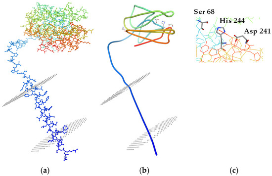 Figure 6. A 3D molecular model of the GDSL-type esterase/lipase family protein from Brevibacillus thermoruber strain 7, NCBI Reference Sequence WP_029099798.1. The sequence is deduced from genome mining of the whole genome shotgun sequence of B. thermoruber 423. The gene responsible, located in Scaffold 5, encodes a protein of 262 amino acids, which corresponds to the 28 kDa protein with PLA-degrading activity isolated by Atanasova et al. [67] from Br. thermoruber strain 7. (a) Ball and stick model presentation; (b) tube model; (c) catalytic triad.