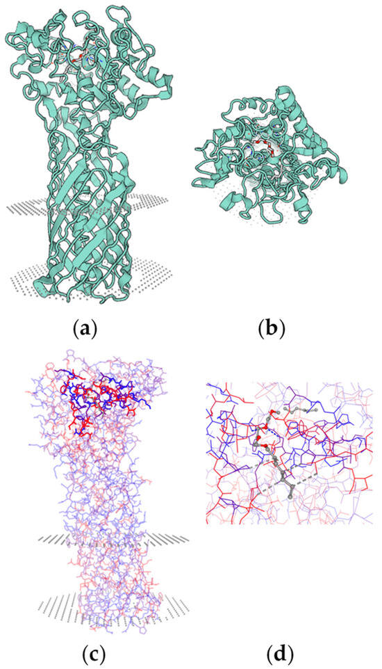 Figure 7. (a) Molecular model (3D) of the full-length carboxyl esterase EstA (E.C. 3.1.1.1) from Pseudomonas aeruginosa ATCC 15692, illustrating the protein’s contact with the outer cell membrane; (b) 3D view of the enzyme after a 90° horizontal rotation; (c) amino acid residues located in the hydrophobic pocket (illustrated in blue and red); (d) hydrophobic interactions with a model substrate (hydroxyethyl-oxy) tri(ethyl-oxy)octane). The SWISS-MODEL tool ‘Protein-Ligand Interaction Profiler’ predicts that eight amino acids are involved in hydrophobic interactions: L25, P198, I242, L293, and P300; S24 and N157, which form hydrogen bonds; and G102, which forms water bridges. The SWISS-MODEL Workspace https://swissmodel.expasy.org/ (accessed on 11 May 2025) was used to create the model and generate the prediction.