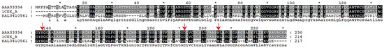 Figure 8. Comparison of amino acids in fungal cutinases (EC 3.1.1.74) using the free software GeneDoc v2.7. NCBI GenBank accession numbers and species: AAA33334, Fusarium solani; 1CEX_A, F. vanettenii; KAL3410561, Asp. fumigatus. Black shading indicates the conservation mode, red arrows highlight the amino acids involved in the active center, and asterisks indicate intermediate numbering of amino acids.