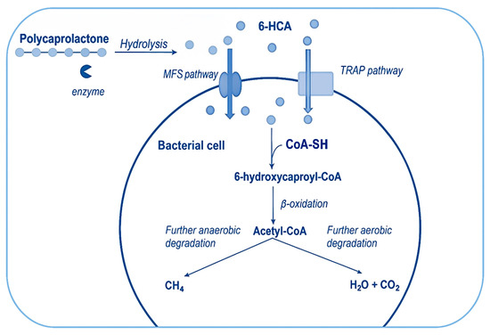 The post-hydrolysis stages of PCL biodegradation (Figure 9)—that is, the assimilation and further metabolization of lower-weight products followed by the excretion of waste molecules such as H2O and CO2 or, for some anaerobes, CH4—remain a largely unexplored area in bioplastic research.