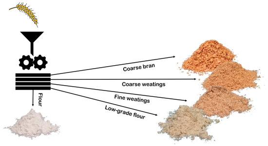 MBPs vary depending on the milling stage at which they are produced and can be classified into four categories: coarse bran (CB), also known as regular bran; coarse weatings (CW), also called fine bran; fine weatings (FW), also known as middlings or shorts; and low-grade flour (LGF), also referred to as red dog [16]. CB consists of all outer layers along with traces of starchy endosperm. It has a wide particle size distribution (~1153 µm) and is composed of approximately 51% dietary fiber, 22% starch, 18.9% proteins, 5.4% ash, and 2.8% lipids. CW is obtained later in the milling process and has finer particles (~449 µm) with a relatively higher proportion of endosperm. Its composition includes 43.2% dietary fiber, 28.8% starch, 18.8% proteins, 4.6% ash, and 3.7% lipids. FW and LGF have even finer particle sizes (~249 µm for FW, ~173 µm for LGF); the former contains 31.9% dietary fiber, 40.5% starch, 19.5% proteins, 3.8% ash, and 5.0% lipids, while the latter has 14.5% dietary fiber, 54.4% starch, 18.8% proteins, 2.8% ash, and 5.7% lipids [15,16] (Figure 1).