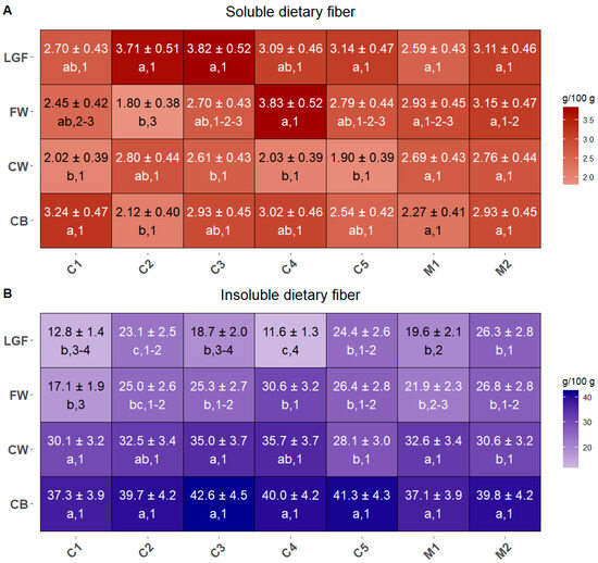 Regarding soluble fibers (Figure 2A), a significant variability was observed among the MBPs across most commercial cultivar and mixtures. The only exceptions were M1 and M2, where all four MBPs showed similar concentrations. These variations make it difficult to identify which MBP was the richest in soluble fibers, and, as a general trend, all cultivar and mixtures exhibited comparable levels. Specifically, CB, CW, and LGF did not differ significantly among cultivar and mixtures, while FW was notably higher in cultivar C4 compared to C1 and C2.