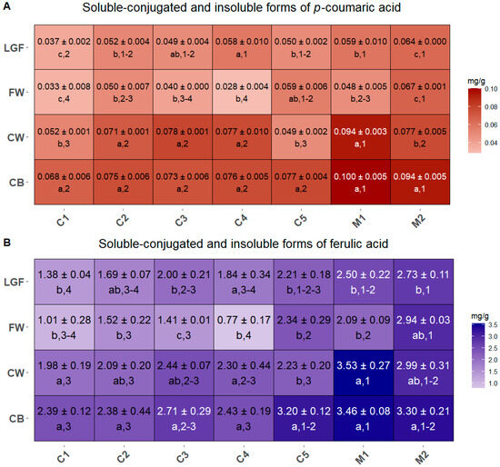 Concentration of soluble-conjugated and insoluble forms of p-coumaric acid (A) and ferulic acid (B) contained in the MBP of each commercial mixture. Data are expressed as mg/g dry weight. Different letters (shown in the line below the values) indicate significant differences among MBPs within each cultivar/mixture, while different numbers (also shown below the values) indicate significant differences between cultivars/mixtures for each MBP. Statistical significance was assessed using one-way ANOVA followed by Tukey’s HSD post hoc test (p < 0.05).