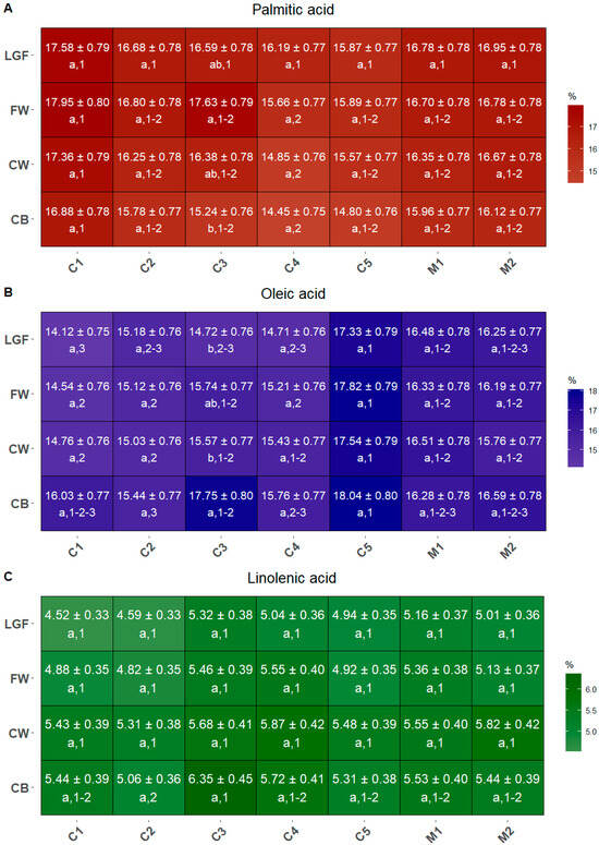 Finally, the predominant PUFAs were linoleic and linolenic acids. Linoleic acid did not exhibit any significant differences either within or among cultivars and mixtures, whereas linolenic acid concentrations differed significantly only between the CB fractions of C2 and C3 (Figure 4C).