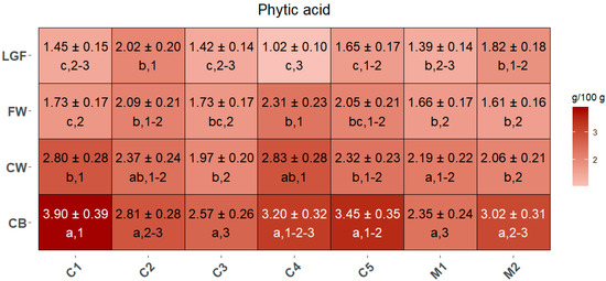 Phytic acid was quantified in all MBPs, with concentrations ranging from 1.02 to 3.90 g/100 g (Figure 5). In general, its concentration decreased with the increasing fineness of the MBP. In C1, C3, C5 and M2, CB contained significantly higher concentrations of phytic acid than the other MBPs. In all the cultivars and mixtures analyzed, CW was always significantly different from LGF, except in C2 and M2. Similarly, FW was consistently significantly different from CB across all samples. FW and LGF generally did not show significant differences in any of the cultivars and mixtures, except in C4, where LGF exhibited a significantly lower phytic acid concentration compared to FW.