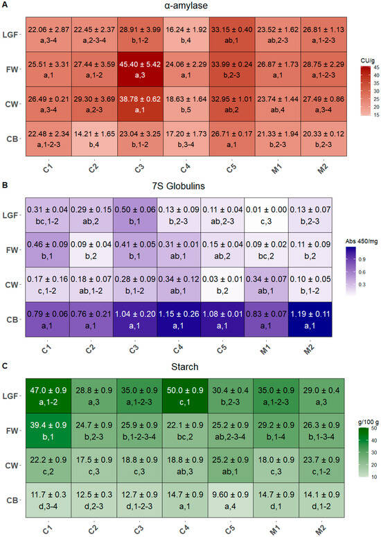 Concentration of α-amylase (A), 7S globulins (B), and starch (C) contained in the MBPs of all commercial mixtures. Data are expressed as CU/g, Abs450/mg and g/100 g dry weight, respectively. Different letters (shown in the line below the values) indicate significant differences among MBPs within each cultivar/mixture, while different numbers (also shown below the values) indicate significant differences between cultivars/mixtures for each MBP. Statistical significance was assessed using one-way ANOVA followed by Tukey’s HSD post hoc test (p < 0.05).