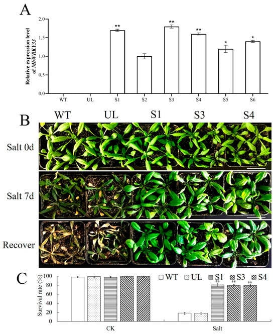 Chicago/Turabian StyleWang, Xinhui, Ming Gao, Yihan Kong, Qian Yu, Lu Yao, Xingguo Li, Wenhui Li, Wanda Liu, Ruining Hou, Lihua Zhang, and et al. 2025. "Overexpression of a Malus baccata (L.) Borkh WRKY Factor Gene MbWRKY33 Increased High Salinity Stress Tolerance in Arabidopsis thaliana" International Journal of Molecular Sciences 26, no. 12: 5833. https://doi.org/10.3390/ijms26125833