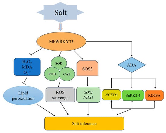 2.5. MbWRKY33 Activates Downstream Salt-Tolerance Related Genes in A. thaliana
