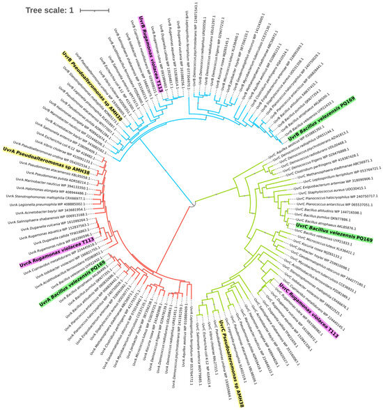 3.3. Phylogenetic Analysis of UV Resistance-Related Proteins