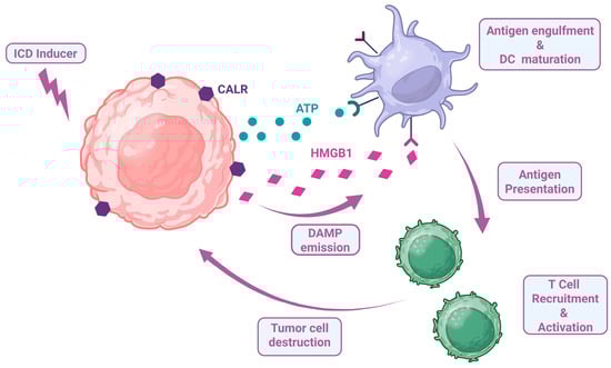 Immunogenic cell death (ICD) and its role in antitumor immunity. Upon exposure to an ICD inducer, tumor cells undergo immunogenic cell death characterized by the release and surface exposure of damage-associated molecular patterns (DAMPs), which include calreticulin (CALR), adenosine triphosphate (ATP) and high-mobility group box 1 (HMGB1). These DAMPs collectively stimulate antigen engulfment and dendritic cell (DC) maturation, enabling effective tumor antigen presentation to T cells. The subsequent T-cell recruitment and activation culminate in a robust antitumor immune response and tumor cell destruction. Figure produced using “BioRender.com (accessed on 23 May 2025)”.