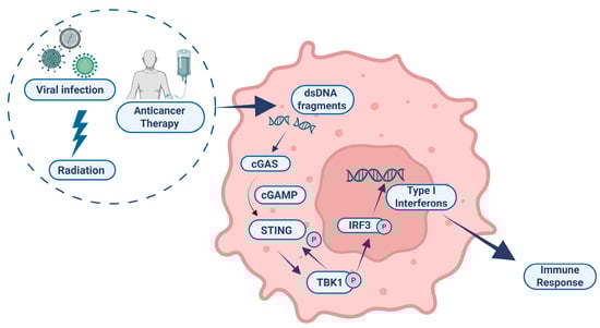 The role of the cGAS-STING pathway in health and cancer therapy. Various stressors such as viral infection, anticancer therapies or radiation can lead to the accumulation of double-stranded DNA (dsDNA) fragments in the cytosol. These fragments are sensed by cyclic GMP–AMP synthase (cGAS), which catalyzes the production of cyclic GMP–AMP (cGAMP). cGAMP binds to and activates the adaptor protein STING (stimulator of interferon genes), triggering its phosphorylation. Activated STING recruits and activates TANK-binding kinase 1 (TBK1), which subsequently phosphorylates the transcription factor IRF3 (interferon regulatory factor 3). Phosphorylated IRF3 translocates into the nucleus, where it induces the expression of type I interferons. These interferons play a critical role in promoting an immune response, contributing to antiviral defense and antitumor immunity. Figure produced using “BioRender.com (accessed on 23 May 2025)”.