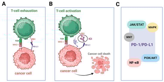 The PD-1/PD-L1 signaling pathway in the onset, progression and management of cancer. (A) The interaction of PD-1 and PD-L1 facilitates tumor survival. Specifically, the interaction between PD-1 and its ligand, PD-L1, leads to T-cell and malignant-cell engagement, suppresses downstream T-cell receptor (TCR) signaling and effectively inhibits T-cell activation, which impedes antitumor immune responses. (B) Activation of T cells and cancer cell death. The administration of ICIs, such as anti-PD-1 antibodies, can restore the function of exhausted T cells, thereby enhancing their cytotoxic activity and facilitating the elimination of tumor cells. (C) Regulation of PD-1/PD-L1 expression by various pathways. Multiple intracellular signaling cascades, including the JAK/STAT, MAPK, WNT, PI3K/AKT and NF-κΒ pathways, are implicated in regulating PD-L1 expression and contributing to tumor immune-evasion mechanisms. Figure produced using “BioRender.com (accessed on 24 May 2025)”.