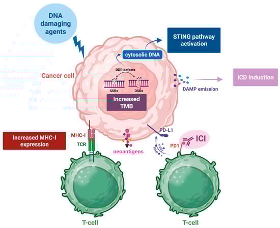 DDR-induced immunogenic modulation. DNA-damaging agents induce a variety of DNA lesions, and if repair is unsuccessful, they may increase the tumor mutational burden (TMB). An elevated TMB promotes the generation of neoantigens, which are presented on MHC class I molecules to T-cell receptors (TCR), enhancing T-cell recognition. DNA damage also results in cytosolic DNA accumulation, triggering STING pathway activation and the release of damage-associated molecular patterns (DAMPs), thereby promoting immunogenic cell death (ICD). Concurrently, cancer cells may upregulate PD-L1 expression to evade immune responses through a PD-1/PD-L1 interaction. Immune checkpoint inhibitors (ICIs) block this pathway, restoring T-cell function and reinforcing their antitumor activity. This illustration highlights how DDR-targeting therapies can synergize with ICIs to potentiate cancer immunotherapy. Figure produced using “BioRender.com (accessed on 23 May 2025)”.