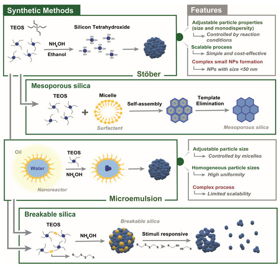 Scheme of different silica nanoparticles synthetic pathways with corresponding features.
