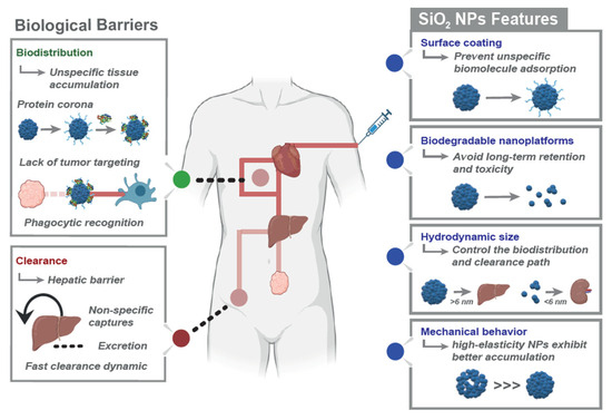 If the nanosystems successfully circumvented sequestration by the MPS; overcame other barriers, such as opsonization and intratumoral pressure gradients; and performed their therapeutic activity on the target, the particle debris should completely leave the body by biodegradation and/or excretion (Figure 2) to avoid long-term retention and the risk of severe toxicity. Biodegradable NPs and renal-clearable NPs have been approved for clinical trials. Non-degradable nanomaterials pose biosafety concerns and have hardly been approved by regulatory agencies [113]. Silica can degrade slowly in aqueous media due to the hydrolysis of the -Si-O-Si- bonds into two -Si-OH units [116,117]. In particular, the nucleophilic interaction between the hydroxyl groups in aqueous media and the non-bridging oxygen on the surface of MSNs generates soluble silicic acid [21,117,118]. The degradation behavior depends on factors, such as the degree of condensation of the structure, particle size, pore size and texture, degree of aggregation, functionalization groups, and the presence of inorganic or organic species in the silica structure [117,118].