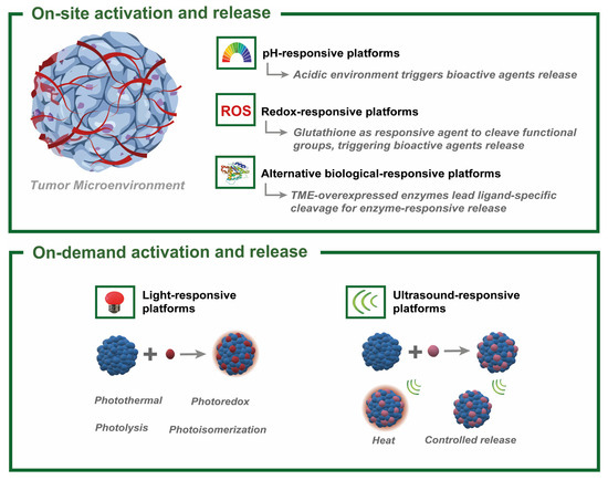 The systemic administration of nanomedicines in high concentrations to overcome biological barriers and to ensure they reach the tumor may seem logical. However, this approach often causes adverse side effects in healthy tissues and organs. In this regard, the possibility that the therapy may only exert its action in response to specific disease stimuli [23] or the TME (Figure 3) has been raised. Recent studies revealing their successful arrival and accumulation in a tumor [17,18], while avoiding the MPS, could lead to promising results for this approach. This would ensure that the SNPs are activated and act only once the NPs reach the tumor. Silica-based nanomaterials containing a cleavable silica framework have acted as stimuli-responsive DDSs [41,49,50,51,52,54,55,59,120], which hold great promise for minimizing side effects and improving the selectivity of treatments. The stimuli to which these systems respond can be physical (temperature, light, ultrasound, magnetism, and electrical stimuli), chemical (pH and oxidative state), or biological (enzymes and metabolites) [4]. Herein, we highlight some of the most successful examples recently explored in the literature, distinguishing between on-site activation and release induced within TMEs and the off-tumor external stimuli used to activate cargo release.