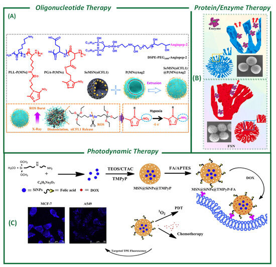 Literature examples of different possible therapies exploiting silica-based nanomaterials as delivery systems. (A) Oligonucleotide therapy: Biodegradable selenium-containing mesoporous silica nanocapsule capable of transporting and initiating RNAi by high-energy X-ray irradiation. Reprinted with permission from American Chemical Society (reproduced with permission from Tang, X. [153]). (B) Protein/enzyme therapy: Influence of MSN pores (dendritic mesoporous silica nanospheres (DMSNs) with funnel-shaped wide-open pores and fractal silica nanoparticles (FSNs)) on enzyme loading, release, and reusability. Copyright permission from Elsevier (reproduced from Kothalawala, S.G. et al. [158]). (C) PDT: Scheme of synthesis of MSN@SiNPs@TMPyP-FA for targeted two-photon-excited fluorescence imaging-guided PDT and chemotherapy. Reprinted with permission from Elsevier (reproduced from Li, S. et al. [173]).