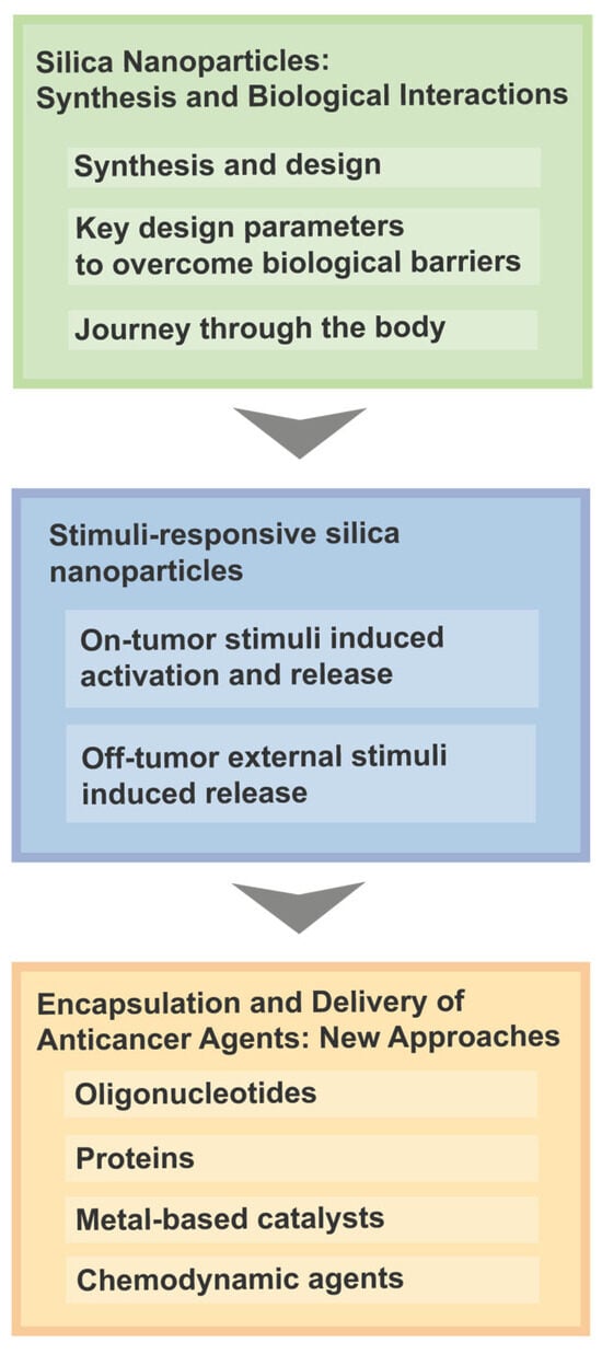 The present review surveys the latest advances in the use and performance of silica-based nanoparticles (SNPs), which have been designed and developed to improve the therapeutic and diagnostic efficacy index, reduce the off-target toxicity, and adjust the pharmacokinetic profile [3,19,20]. These nanosystems have exhibited stimuli-responsive release and active targeting properties (achieved through ligands like antibodies, aptamers, and peptides) [4,19,21,22,23,24,25,26]. To help readers navigate through the main sections and topics covered in this review, we have included a concise flowchart in Scheme 1 (vide infra).