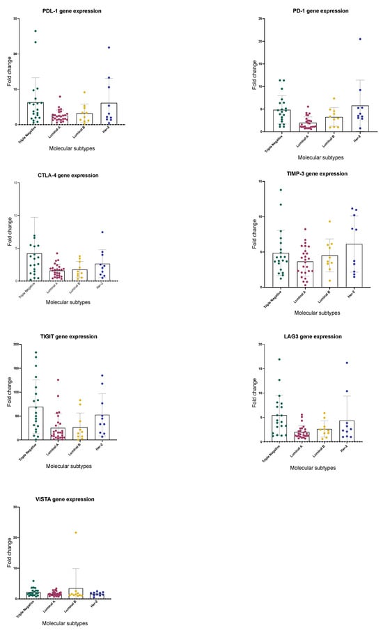 The percentage of patients with fold change gene expression > 2 was also higher in triple-negative tumors, followed by Her-2+ tumors. PD-L1 gene expression was highest in triple-negative breast cancer, where 70% of tissues showed >2-fold change, followed by Her-2+ (66%), Luminal B (52%), and Luminal A (50%). PD-1 expression was also significantly higher in tumors from triple-negative (80%) and Her-2+ (86.7%) compared to Luminal A (45%) and Luminal B (41.2%) breast tumors. CTLA-4 gene expression was also higher in triple-negative (65%) and Her-2+ (60%) tumors than gene expression in Luminal A (30%) and Luminal B (17.6%) tumors. No significant differences in TIM-3 gene expression were observed between molecular subtypes: >2-fold change in 75% of Luminal A tumors, 80% in Her-2+, 88.2% in Triple-Negative, and 88.2% in Luminal B. The most highly expressed immune checkpoint was TIGIT: >2-fold change was seen in 85% (Luminal A), 94.1% (Luminal B), 95% (triple-negative), and 100% in Her-2+ tumors. LAG-3 expression was also higher in triple-negative (75%) and Her-2+ (73.3%) tumors compared to Luminal A (45%) and Luminal B (41.18%). The immune checkpoint with the lowest expression in breast cancer was VISTA, where increased expression was observed in only 25% of Luminal A tumors, 20% in Luminal B, 6.7% in Her-2+, and 40% in the triple-negative.