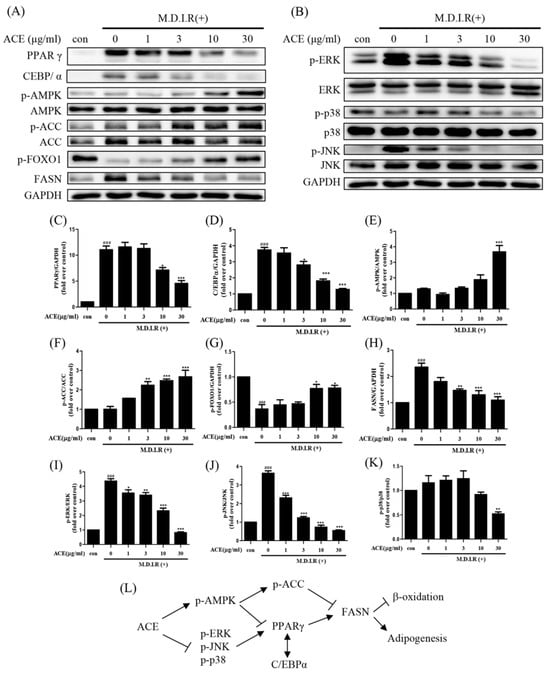 - Prusty, D.; Park, B.H.; Davis, K.E.; Farmer, S.R. Activation of MEK/ERK signaling promotes adipogenesis by enhancing peroxisome proliferator-activated receptor gamma (PPARgamma) and C/EBPalpha gene expression during the differentiation of 3T3-L1 preadipocytes. J. Biol. Chem. 2002, 277, 46226–46232. [Google Scholar] [CrossRef]