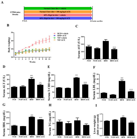 2.3. Antrodia cinnamomea Alcohol Extract Reduces High-Fat Diet-Induced Body Weight Gain and Improves Serum Biochemical Parameters in Mice