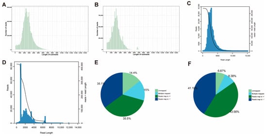 Summary of Iso-seq data. (A,B) Length distribution of subreads; the horizontal coordinate indicates the length of the subreads, the vertical coordinate is the number of subreads, (A) denotes the length distribution of subreads for testis, (B) denotes the length distribution of subreads for ovary. (C,D) FLNC length distribution map; the x-axis indicates the length of the FLNC reads, the left Y-axis is a bar graph coordinate indicating the number of reads in a range of lengths (X-axis), the Y-axis on the right is the plot coordinates indicating the number of reads whose length is greater than a certain X-axis value, (C) denotes the FLNC length profile of testis, and (D) denotes the ovary. (E,F) The percentage of high-quality isoforms mapped to the reference genome; (E) denotes the result for testis and (F) denotes the result for ovary.