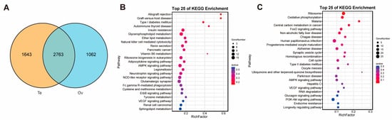 Among the genes mapped to the reference genome for the ovary and testis, 2763 were shared between the two gonadal tissues (Figure 3A). A total of 1062 genes were specifically identified in the ovary, enriched in pathways such as ribosome, oxidative phosphorylation, and malaria (Figure 3C). In contrast, 1643 genes were uniquely identified in the testis, with enrichment in pathways including allograft rejection, graft-versus-host disease, and type I diabetes mellitus (Figure 3B).