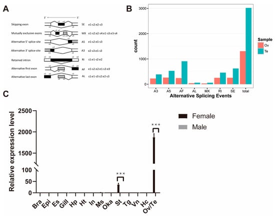 SUPPA [39] was used to ascertain the frequencies of seven major AS types (skipping exon, SE; alternative 5′ splice sites, A5; alternative 3′ splice sites, A3; mutually exclusive exons, MX; retained intron, RI; alternative first exons, AF; alternative last exons, AL) in the testis and ovary iso-Seq data (Figure 4A). In total, 3019 AS events were identified in the testis. The most abundant of these was AF, which accounted for 30.08% of all AS events in the testis. In total, 1307 AS events were identified in the ovary. In contrast to the testis, the ovary was most common in A5, accounting for 19.97% of all AS events in the ovary. However, the four types of AS events, SE, RI, AF, and A3, accounted for a similar and close to A5 proportion of all AS events in the ovary. In both tissues, the fewest AS events were identified in AL (1.95% of testis and 2.98% of ovary) and MX (1.92% of testis and 2.37% of ovary) (Figure 4B).
