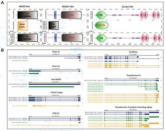 Alternative splicing isoform analysis. (A) Structural domains of different transcripts of MAD2-like, RAD51-like, and Su(dx)-like. (B) Alternative splicing analysis of known sex-determining and differential genes.