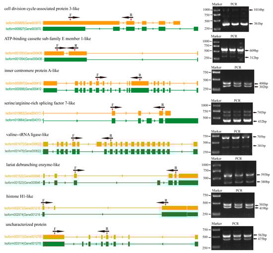 To verify the accuracy of the isoforms identified by Iso-Seq, 10 genes containing AS events were randomly selected and the presence of the different isoforms was verified by PCR and gel electrophoresis. Primers were designed in the overlapping regions of different transcripts of the same gene. The experimental results showed that 8 out of 10 genes were successfully validated. The sizes of the amplified products were consistent with the target fragments predicted by Iso-Seq, and the Sanger sequencing of these amplified products proved to be the same as the Iso-seq sequencing results, which confirmed the confidence of the Iso-Seq data (Figure 6).