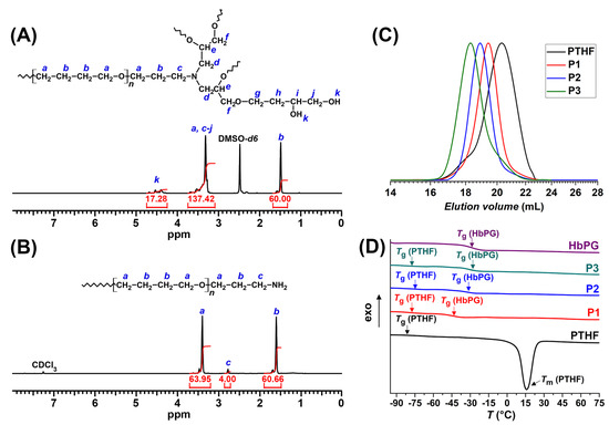 The 1H NMR spectra of the P1 HbPG-PTHF-HbPG block copolymer ((A), in DMSO-d6) and the initial amine-telechelic PTHF ((B), in CDCl3). The GPC chromatograms of the HbPG-PTHF-HbPG amphiphilic block copolymers and the initial PHTF (C). DSC curves of the HbPG-PTHF-HbPG amphiphilic block copolymers, the initial PHTF, and the HbPG control sample synthesized by pentaerythritol initiator (D).