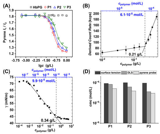 Pyrene I1/I3 values as a function of polymer concentration (A). Derived count rate determined by DLS (B) and surface tension (C) of the aqueous solutions of HbPG-PTHF-HbPG amphiphilic block copolymer (P2) as a function of the polymer concentration (the cmc value is marked with dashed line). The cmc values of the HbPG-PTHF-HbPG block copolymers obtained by the three different methods (D).