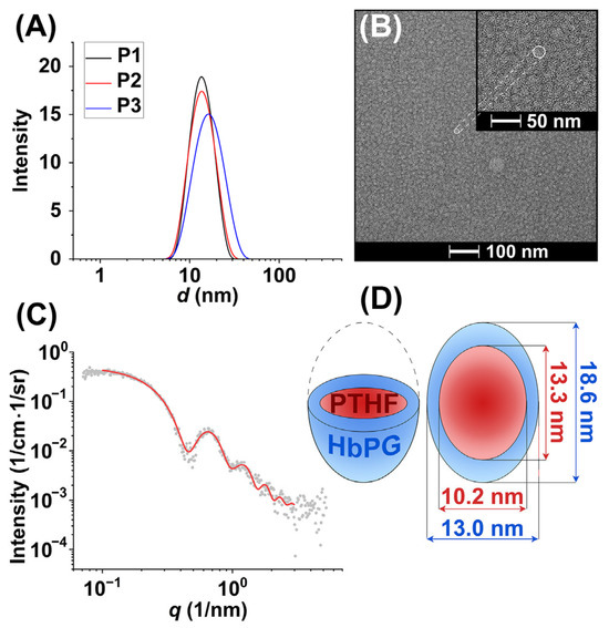 The DLS curves of the HbPG-PTHF-HbPG block copolymer micelles (A). TEM images of P2 block copolymer-based micelles (B). The scattering curve of the P1 block copolymer-based micelles (C) and a schematic illustration of the formed micelles according to SAXS measurement (D).