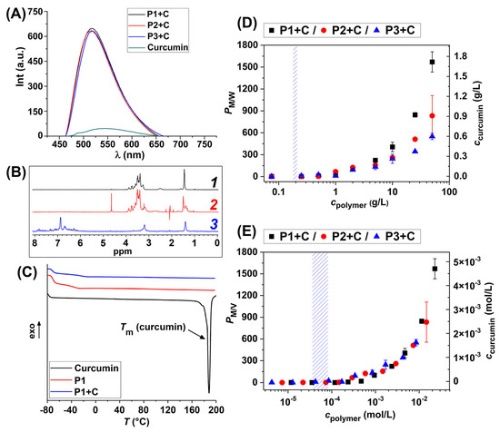 Fluorescence spectra of the curcumin-loaded HbPG-PTHF-HbPG nanomicelles and curcumin (A). 1H NMR spectra of the curcumin-free block copolymer P1 ((B), 1), 1H NMR ((B), 2), and 1H dpfgse NOESY (irradiation at 7.14 ppm) ((B), 3) spectra of curcumin-loaded HbPG-PTHF-HbPG micelles in D2O at 25 °C. The DSC thermograms of curcumin, P1, and curcumin-loaded P1 micelles (C). Micelle/water partition coefficient (PM/W) and curcumin concentration as a function of mass (D) and molar (E) concentration of the HbPG-PTHF-HbPG amphiphilic block copolymers (the marked areas denote the region of the cmc).