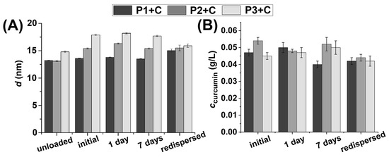 The size and drug content of curcumin-loaded micelles (cpolymer = 10 g/L and ccurcumin,feed = 0.07 g/L) were monitored by DLS (Zetasizer Nano ZS, Malvern Instruments Ltd., Malvern, UK) and UV-Vis spectroscopy (Jasco V-650 spectrophotometer (JASCO Corporation, Tokyo, Japan), 424 nm, 25 °C) for 7 days. Meanwhile, 2 mL of the curcumin-loaded micellar solutions were prepared at the same concentration and lyophilized overnight. The dry samples were stored at room temperature for 3 days and redispersed in 2 mL of water. The size and curcumin content of the micelles were then measured. All measurements were performed in triplicate.