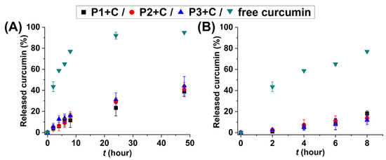Curcumin release of the HbPG-PTHF-HbPG amphiphilic block copolymers and free curcumin: 1 g/L curcumin and 25 g/L polymer solutions (A) and 0.1 g/L curcumin and 1.7 mmol/L polymer solutions (B) were used for the preparation of the curcumin-loaded block copolymer nanomicelles.