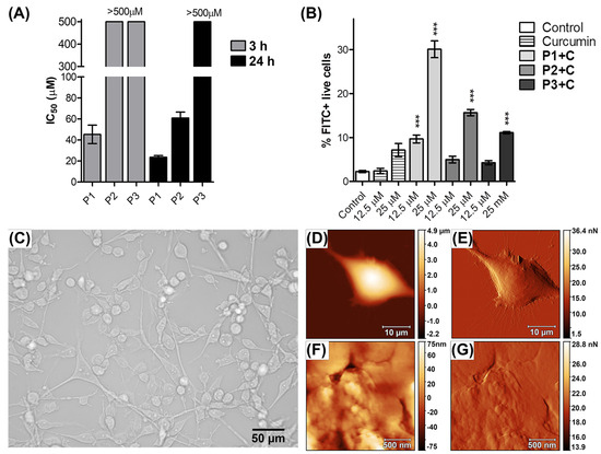 The cytotoxicity of the block copolymers on U-87 glioblastoma cells incubated with the polymers for 3 and 24 h. Bars represent mean IC50 values ± SEM, n = 4 (A). Internalization degree of curcumin and curcumin-loaded micelles of U-87 glioblastoma cells after 3 h treatment with curcumin and P1 + C, P2 + C, P3 + C curcumin-loaded block copolymers. Percentage of FITC-positive live cells (B) is presented. Data are mean ± SEM for n = 3. *** p < 0.0001. During the flow cytometric measurement, relative viability of the compound-treated cells was over 78% compared to untreated control cells. Bright field microscopic image, captured by Olympus CKX objective 10X (C), AFM topography (D), and cantilever deflection (E) images of curcumin-treated and glutaraldehyde-fixed U-87 cells. Surface roughness was determined at the central region of the cells; high-resolution images of the same area are presented in panel (F) (topography) and panel (G) (deflection image). Similar images were obtained for P1 + C, P2 + C, and P3 + C polymers.