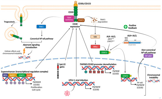 CD30 is a member of the tumor necrosis factor receptor superfamily and plays a crucial role in activating various oncogenic pathways, such as the induction of pro-survival signals and cell proliferation [15]. Overexpression of CD30 generates abnormal signals that lead to chromosomal instability [35]. Signaling originates through contact of CD30 with CD30L/CD153, facilitated by intracellular adapter proteins [36] such as TRAF isoforms [37]. These signal transducers activate canonical (regulated by TAK1 [38]) and non-canonical forms of the NF-κB pathway [39,40]. Additionally, aberrant signaling may be transferred to the inner cell via trogocytosis [16]. CD30 overexpression may be caused by various factors: hypomethylation of its promoter [41] and/or overexpression regulated by several transcription factors (JunB, IRF4, STAT3 or BATF3) forming the “superenhancer” transcriptional complex [42,43,44,45], which also activates different cellular regulation pathways, such as proliferation, cell cycle and apoptosis [46]. Gains of 1p6.22 locus [47], trogocytosis or infection by Human T-Lymphotropic Virus 1 (HTLV-1) have been identified as other causes of CD30 overexpression [16,48,49] (Figure 1).